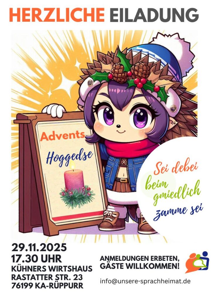 Mit einer „Advents-Hoggedse“, zu der wir Euch jetzt schon einladen dürfen, startet Unsere Sprachheimat in die vorweihnachtliche Zeit.