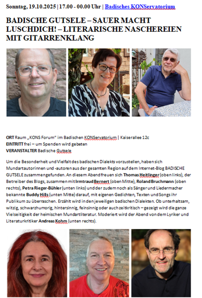 BADISCHE GUTSELE – SAUER MACHT LUSCHDICH! – Literarische Naschereien mit Gitarrenklang von und mit Thomas Heitlinger, Irmtraud Bernert, Roland Bruchmann, Petra Rieger-Bühler und Buddy Hills