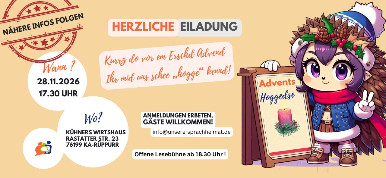 Am 28. 11. 2026 um 17.30 Uhr findet in Karlsruhe-Rüppurr unsere diesjährige Advends-Hoggedse statt.